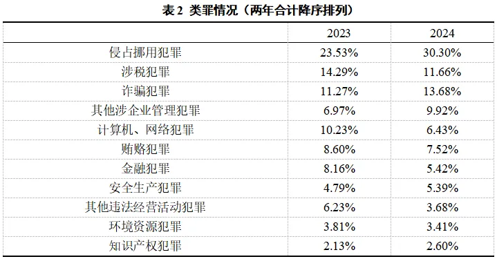 考虑到具体罪名的性质以及罪名之间的关联,同时兼顾刑法分则体系,本报告将企业犯罪划分为11个“类罪”,各个类罪的占比情况详见表2,侵占挪用、涉税、诈骗犯罪位列前三。
