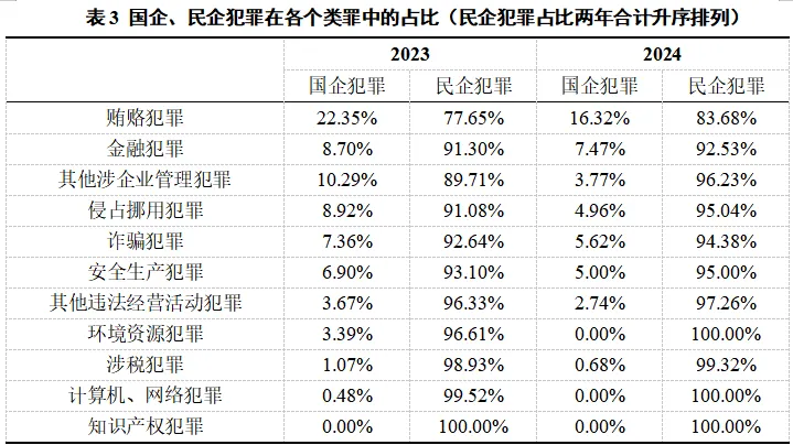 在企业性质明确的3686件案例中,国企、民企犯罪分别占5.91%、94.09%。2023、2024年,国企、民企犯罪在各个类罪中的占比详见表3。其中民企犯罪占绝大多数,知识产权、计算机网络、涉税、环境资源等犯罪基本为民企犯罪。