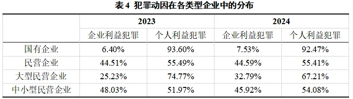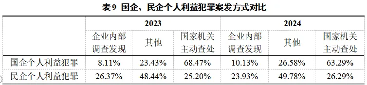 2023、2024年,涉案企业性质及案发方式明确的个人利益犯罪案例分别有877、969件,国家机关主动查处国企个人利益犯罪(往往损害国企利益)的力度显著大于查处民企个人利益犯罪(往往损害民企利益)的力度(χ²(1)=74.424,p<0.001)。详见表9: