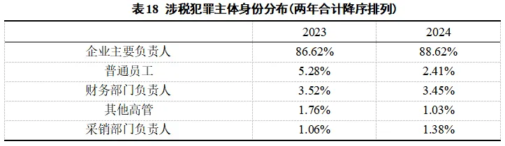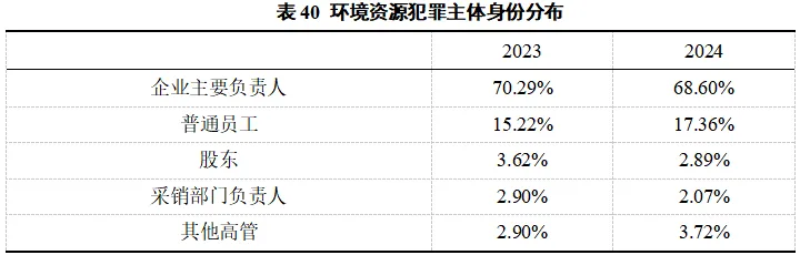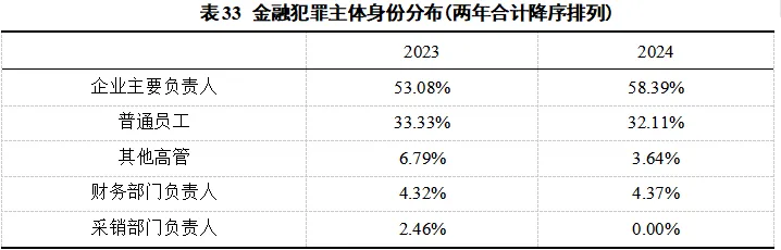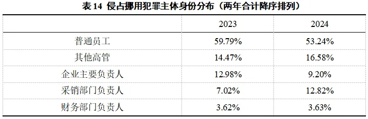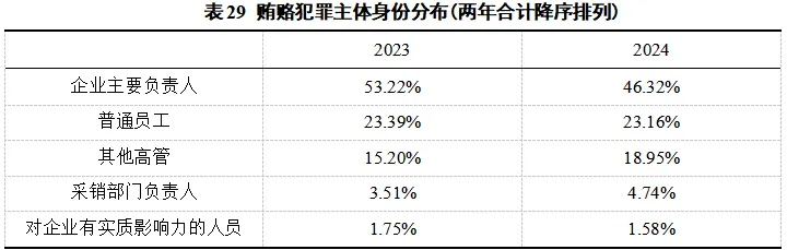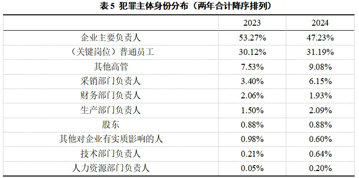 2023、2024年,犯罪主体身份明确的案例分别有1939、2488件。其中,企业主要负责人、(关键岗位)普通员工位列前二,主体身份分布情况详见表5: