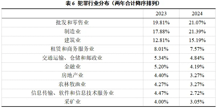 2023、2024年,涉案企业所处行业明确的案例分别有1499、1837件,行业分布情况详见表6(仅列前10):
