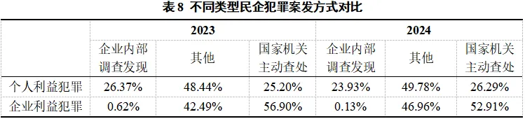 2023、2024年,各个类罪的案发方式存在差异,反映国家机关对各个类罪主动查处的力度不同。具体情况详见表10: