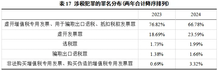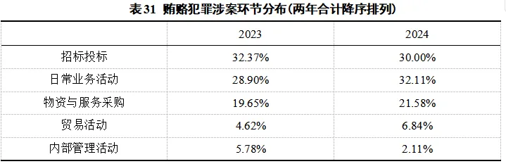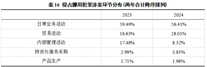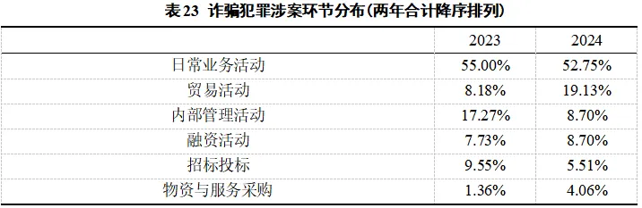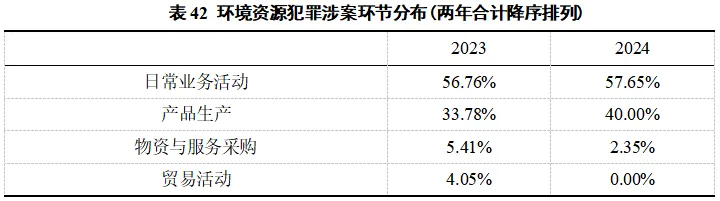 2023、2024年,在犯罪环节明确的案例中,犯罪环节主要集中于日常业务活动(91.35%、88.41%)与产品生产(3.09%、7.25%)。