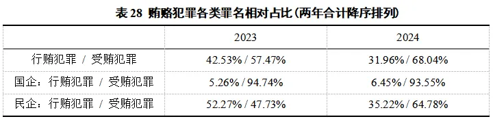 第二,民企受贿犯罪日渐突出。本团队曾对2014至2022年民营企业家贿赂犯罪展开研究,数据显示行贿犯罪占据多数(73%)。尽管统计口径有所不同,但本报告中民企受贿犯罪的数量(64.78%),在“行贿受贿一起查”背景下于2024年超过行贿犯罪(35.22% ),该数据变化在一定程度上反映出民企受贿犯罪日渐突出的现状。随着民营企业规模的扩大,民企管理层级日趋复杂、企业所有权与经营权分离程度日益提高,民企人员基于个人利益、出卖企业利益的受贿犯罪增多具有相当的必然性,民企的内部治理结构亟待完善。