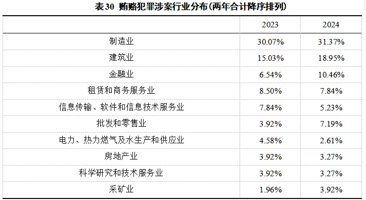 2023、2024年,在涉案企业所处行业明确的案例中,行业分布情况详见表38(仅列前10):