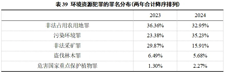 本报告中的环境资源犯罪包括非法占用农用地罪等10个罪名,各罪名分布情况详见表39(仅列前5):