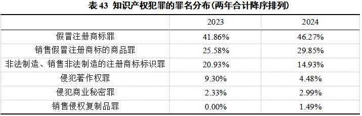 本报告中的知识产权犯罪包括假冒注册商标罪等6个罪名,各罪名分布情况详见表43: