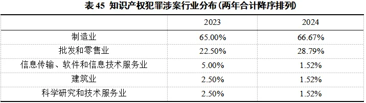 2023、2024年,在涉案企业所处行业明确的案例中,行业分布情况详见表45(仅列前5):