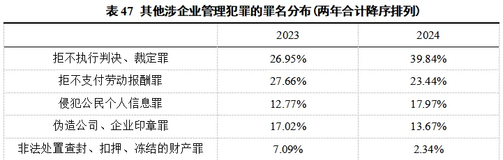 本报告中的其他涉企业管理犯罪包括拒不执行判决、裁定罪等11项罪名,各罪名分布情况详见表47(仅列前5):