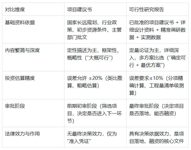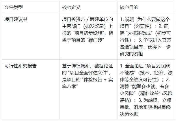 简单说:项目建议书是 “敲门砖”,可行性研究报告是 “通行证”,没有前者就没有后者,没有后者项目就无法真正落地。