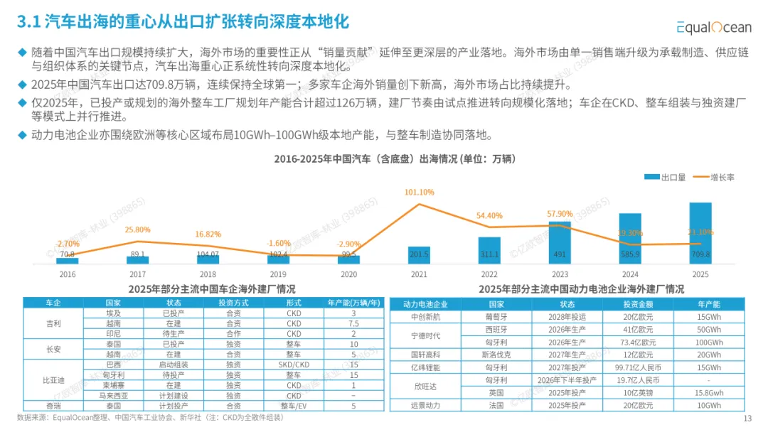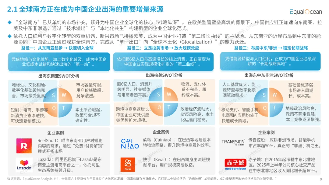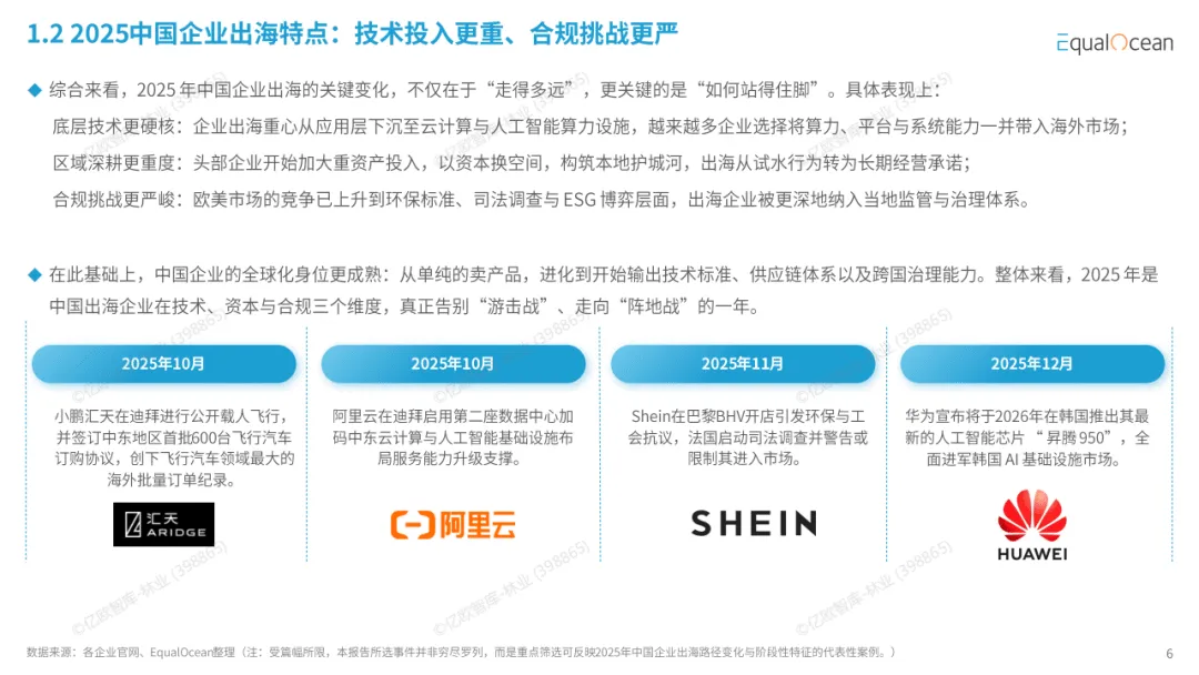 2025年中国企业出海呈现行业覆盖更广、目标市场更多元的特征,从零售电商、新茶饮到AI、汽车等,几乎所有主要行业均加快出海步伐。同时,技术投入持续加重,企业重心下沉至云计算、AI算力设施等底层领域,合规挑战也更为严峻,全球化运营从“游击战”转向“阵地战”。贸易数据表现亮眼,进出口总额突破6.35万亿美元,贸易顺差达1.19万亿美元,共建“一带一路”国家和地区成为出口核心市场,形成“沿海高端制造供给+全球南方市场消化”的双循环格局。