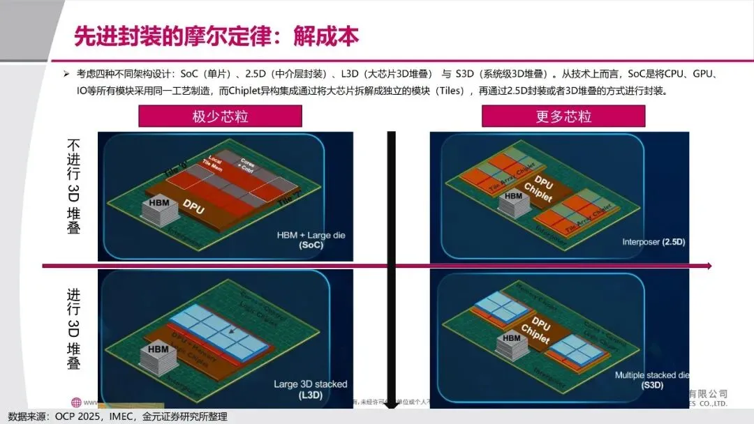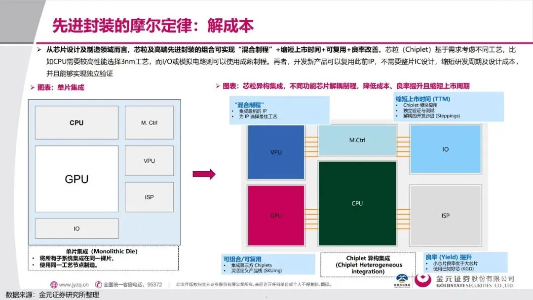 正是在这样的背景下,"先进封装"技术站上了舞台中央,成为破解芯片难题的关键钥匙。简单来说,既然造不出更大的"单片"芯片,那就把几块小芯片像搭积木一样精密地组合在一起。这种被称为"芯粒"的技术,让不同功能的芯片可以采用最适合的制造工艺——比如CPU用最先进的3纳米,而I/O接口用成熟的28纳米,最后通过先进封装整合在一起。这样不仅大大降低了成本,还能让产品更快上市。