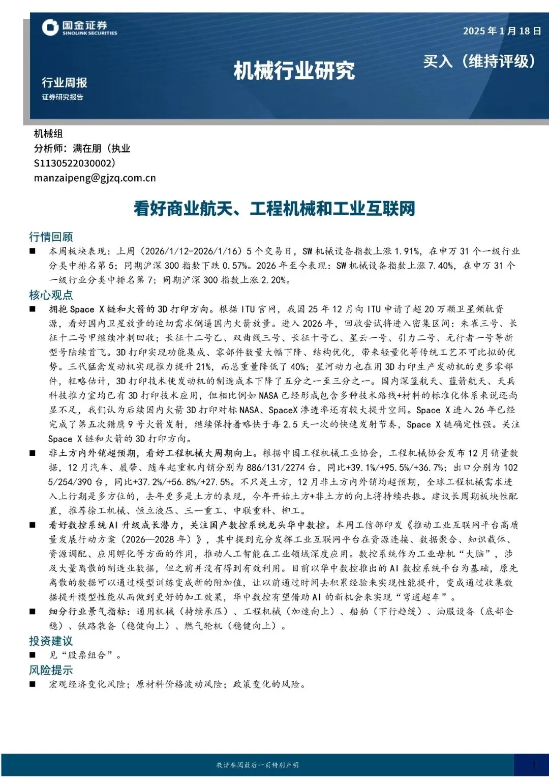 机械行业研究:看好商业航天、工程机械和工业互联网-260118-国金证券-15页