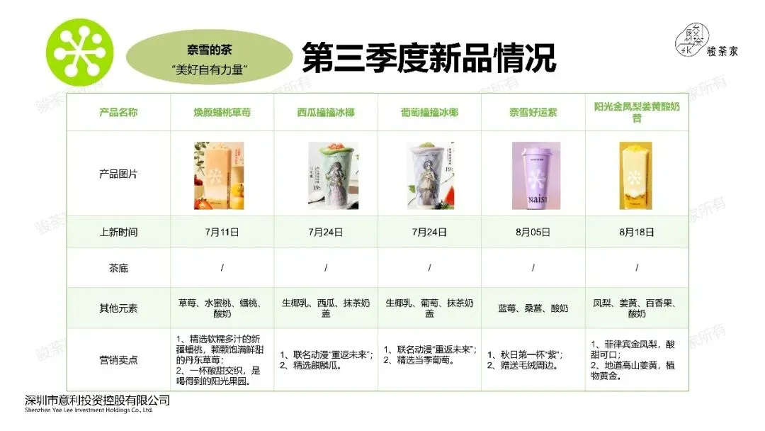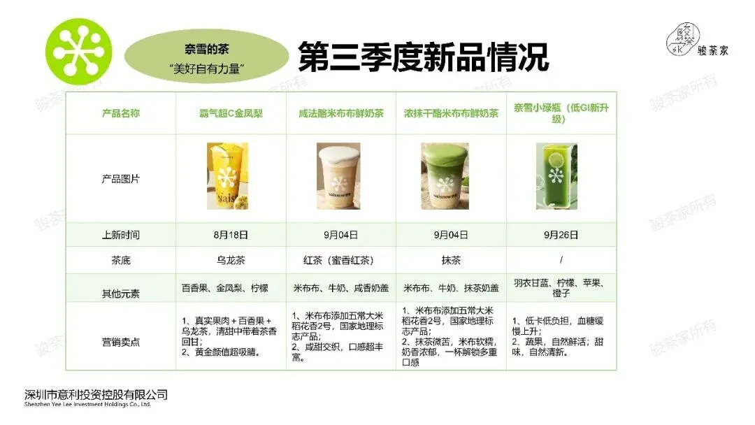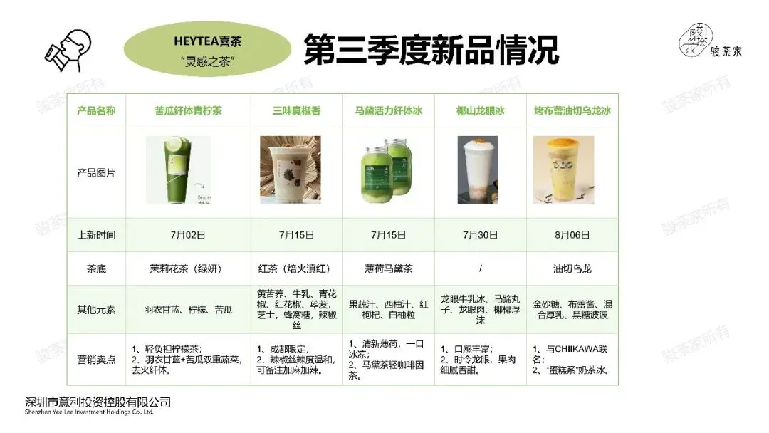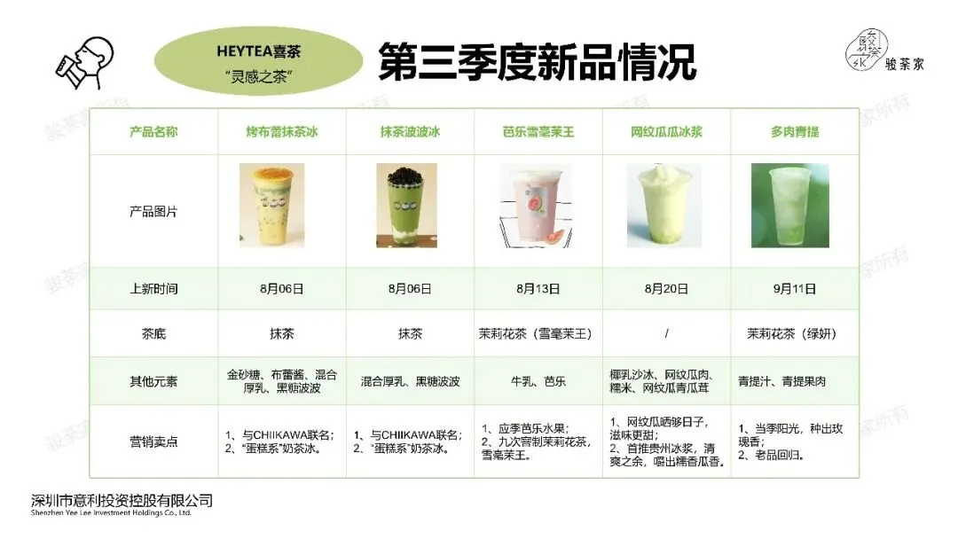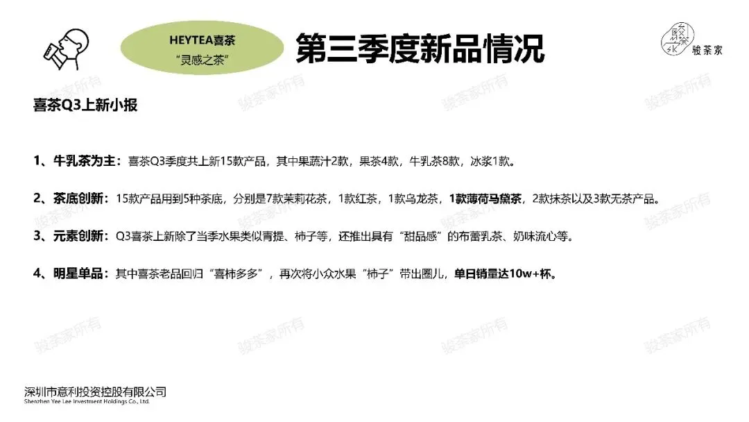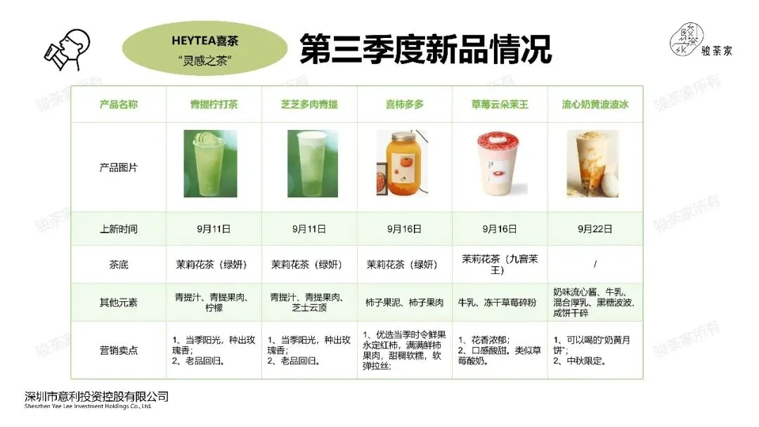 1、牛乳茶为主:喜茶Q3季度共上新15款产品,其中果蔬汁2款,果茶4款,牛乳茶8款,冰浆1款。