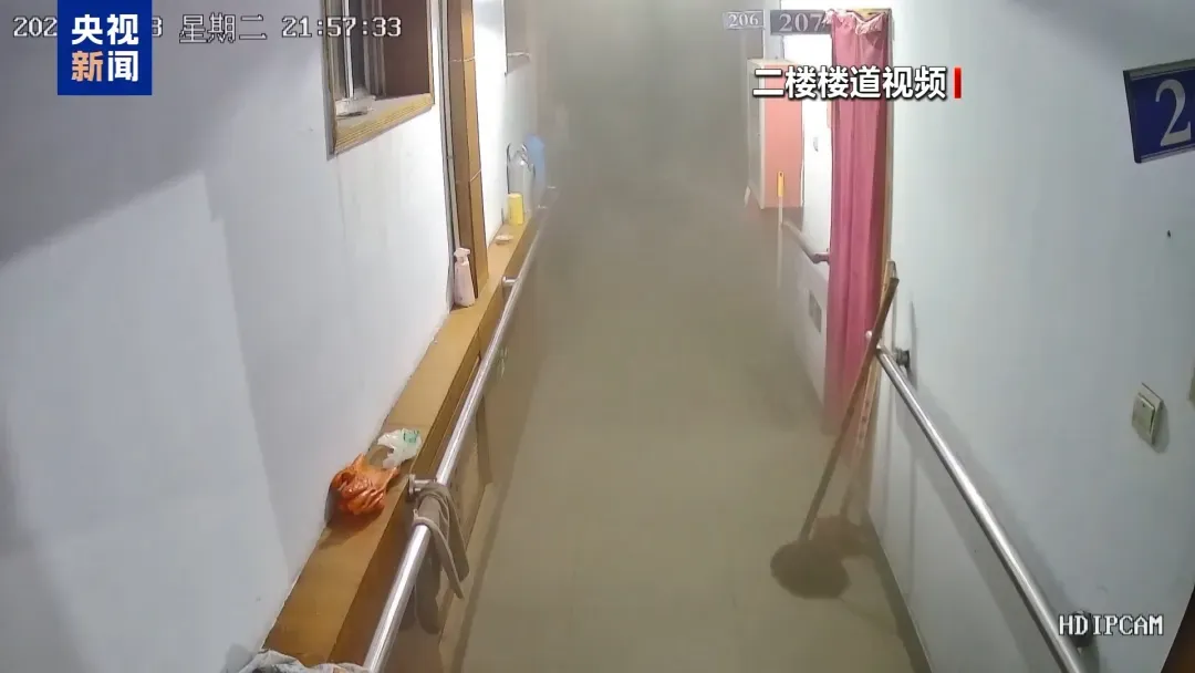 通过老年公寓的二楼公共场所视频可以看到,浓烟犹如一条黑龙,直接快速涌入老年公寓的二楼楼道,短短几秒钟就充斥整个二楼楼道,被浓烟呛醒的人们跑出房间进行逃生避险。大火在建筑内快速蔓延,形成猛烈燃烧状态,很快就突破老年公寓楼房顶。