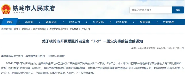 2024年7月9日,辽宁省铁岭市一养老公寓发生火灾。事故造成2名失能老人死亡,直接经济损失9.95万元。