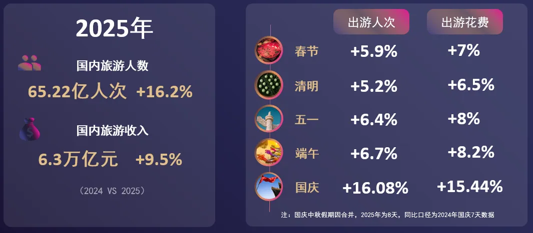 2025年,国内游市场稳步增长,旅游人数与收入齐增。重点节假日旅游市场全线飘红,出游人次与花费同比提升,消费升级与业态创新凸显。
