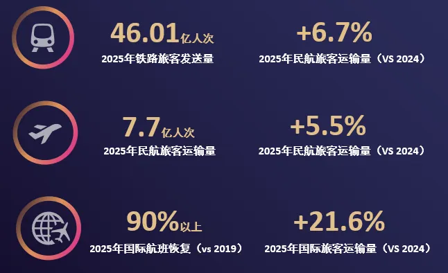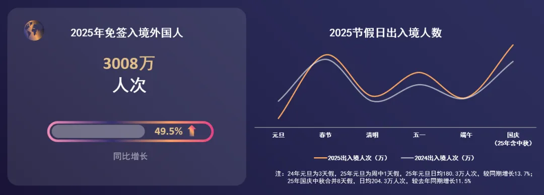 ①免签政策利好,2025年免签入境外国人达3008万人次,同比增长49.5%。