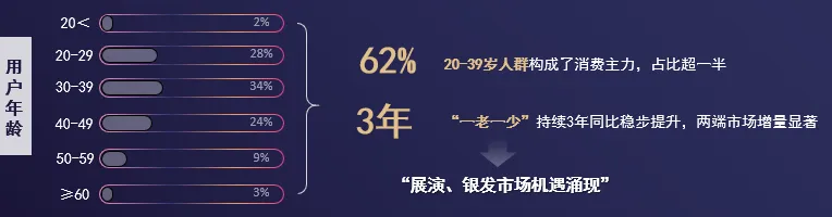 多元客群交织下,“一老一少”(<20岁、≥60岁)用户连续3年同比稳步增长,带动相关细分市场(展演、银发)消费活力:
