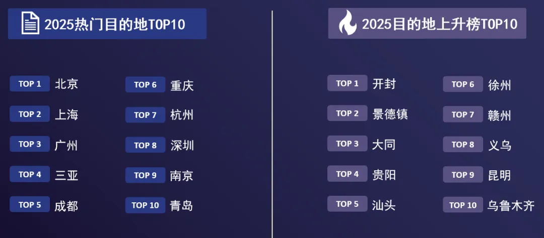 ③北京、上海、广州等传统旅游目的地凭交通网络及旅游设施的优势,热度维稳;社交媒体助推下,万岁山的沉浸互动、景德镇的手工陶艺等特色体验,正带火一批新兴城市。
