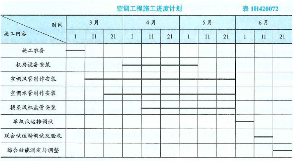 A安装公司项目部在3月1日进场后,因业主采购的设备晚于风管制作安装的开工时间,项目部及时联系空调设备供应商,了解设备的各类参数及到场时间,并及时与B建筑公司协调交叉配合施工的时间与节点。编制了通风空调工程的施工方案、施工进度计划(见表)和材料采购供应计划。