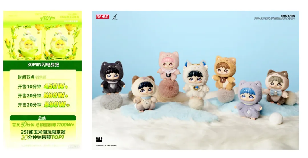 Rays潮玩也颇具代表,通过为田栩宁和梓渝CP粉“甜玉米”们定制毛绒产品,其创下20分钟销售额破500万元的纪录,“甜玉米”IP的贴脸设计在粉丝圈层获得了大规模好感。