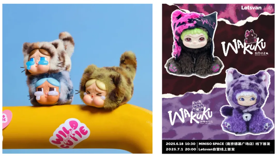 3)动物拟人化:将动物特征与人格结合,都能快速建立认知,但也极易导致形象雷同。受欢迎的元素代表有豹纹系列,比如泡泡玛特crybaby豹豹猫猫系列、WAKUKU豹豹酷、豹豹大王等。