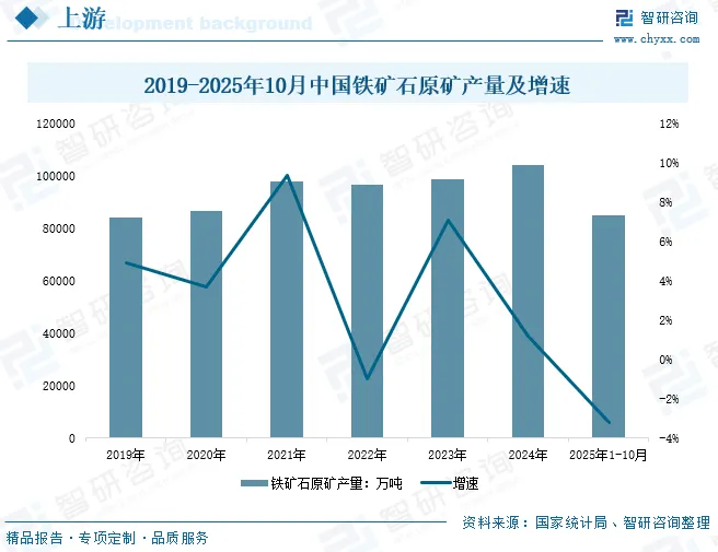 海底管线用钢的本质是 “高强度、高耐腐蚀性的特种低合金钢”,其核心成分仍是铁元素,而铁矿石正是铁元素的最主要来源。我国铁矿石资源较为丰富,在世界铁矿总量中排名第四。然而,由于地质原因,我国铁矿石含铁量有限,大多为贫铁矿。随着市场需求量的增加,我国铁矿石行业处于供不应求的状态。近年来,我国加速国内铁矿山开发计划,提升资源储备,铁矿石产量呈现波动上升趋势,2024年中国铁矿石原矿产量达到104193.5万吨,同比上涨1.2%。2025年1-10月中国铁矿石原矿产量达到85173.6万吨,同比小幅下降3.2%。