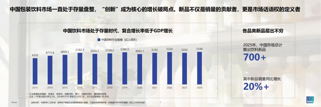 中国包装饮料市场已进入存量盘整阶段,过去11年复合增长率仅2%,CR10营收占行业总销售的56.56%,创新成为行业增长的核心破局点。2025年中国市场推出饮料新品超700款,新品销量同比增长20%以上,场景化深耕与价值需求升级成为行业发展的关键方向。