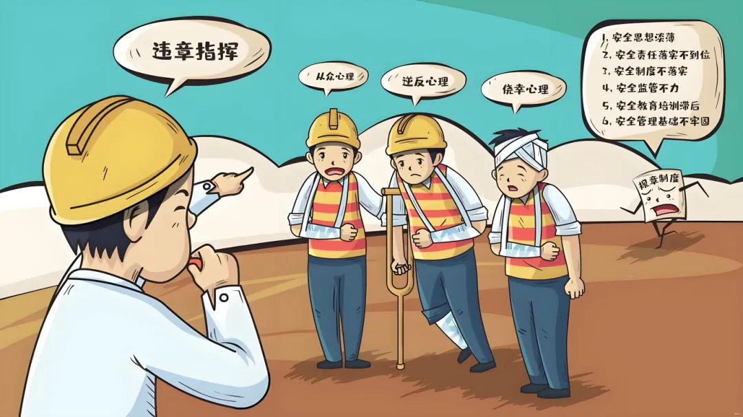 ①人的不安全行为:包括从业人员违反安全规章制度的行为、不执行安全生产指令、不正确使用个人劳动保护用品;管理人员违章指挥、擅自变更安全工艺和操作程序、指挥未经安全培训的劳动者或无相应资质人员作业等。