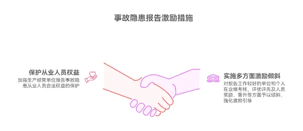 加强正向激励。加强生产经营单位报告事故隐患从业人员合法权益的保护,结合实际,对事故隐患报告工作开展较好的单位和个人,推动在业绩考核、评优评先及人员奖励、晋升等方面予以倾斜,强化激励引导。——安委〔2024〕7号