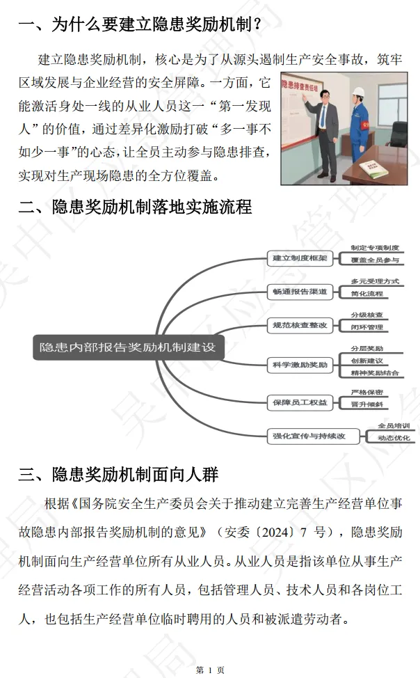 为推动全区工矿企业更好落实隐患内部报告奖励机制,区应急管理局组织专家编制了《隐患内部报告奖励机制建设指南》,供全区工矿企业参考。