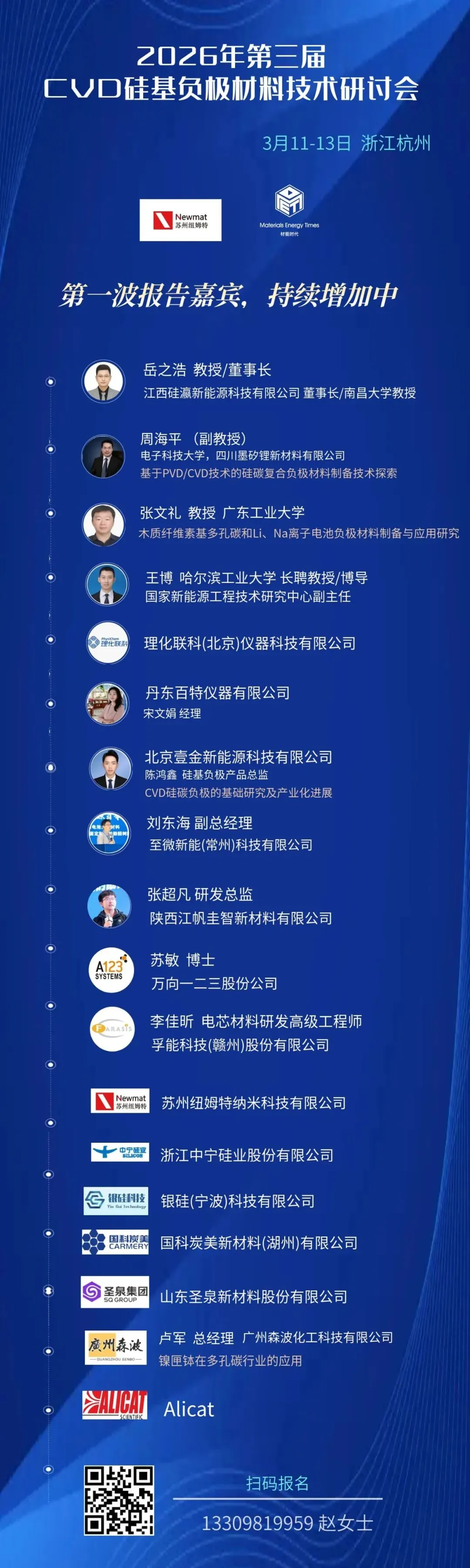 2026年3月11-13日,第三届CVD硅基负极材料技术研讨会将于杭州举行。本届会议由苏州纽姆特纳米科技有限公司与材能时代联合主办。