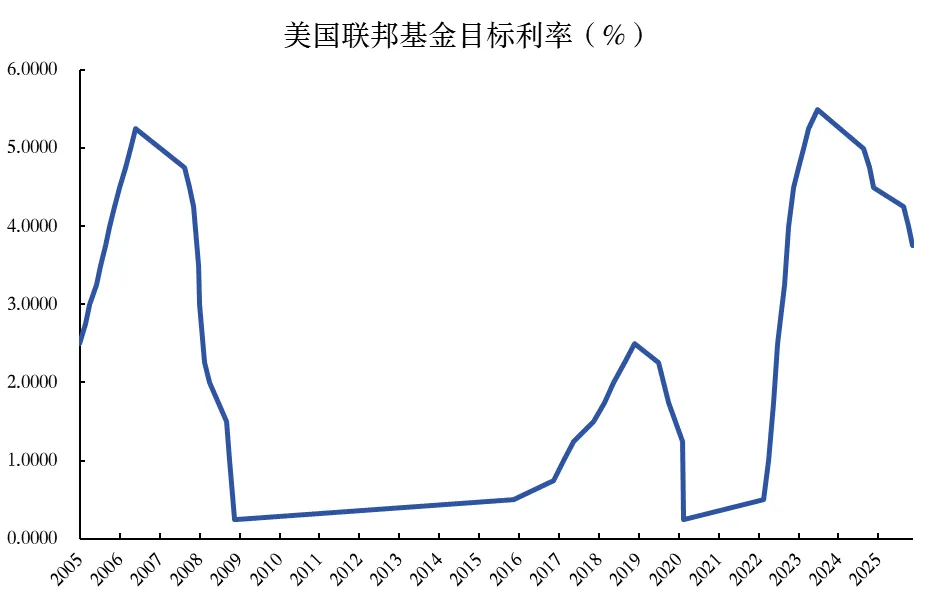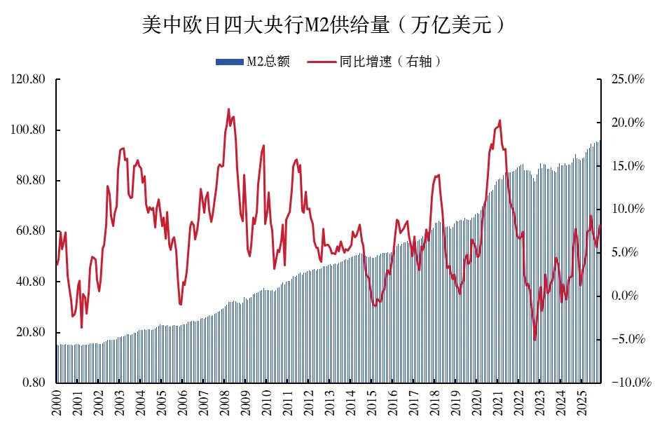 全球货币政策宽松周期提供了充裕的流动性。随着通胀压力的边际缓解与就业市场的修复,2024年以来美联储已正式开启新一轮宽松周期,联邦基准利率进行下行通道,至今已进行6次共计175BP的降息。全球主要央行的M2增速已从2022年的低位显著回升,截至2025年11月,中美欧日四大央行M2同比增速已上升至8.2%,表明全球货币供给已重新步入扩张区间。流动性扩张放大了大宗商品的定价弹性,推动全球商品市场进入由需求扩张、供应受限、流动性充裕三重利好共同驱动的黄金期。
