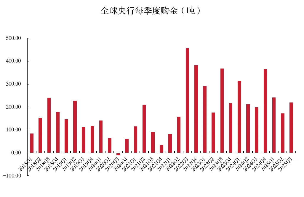 全球央行购金略有放缓,但仍明显高于长期平均水平。从绝对购金量来看,2025年前三季度全球央行购金634吨,较2024年同期下降12.5%,相比2022年历史峰值出现较为明显的回调,但季度净增持规模仍显著高于2022年以前的长期平均水平。这种调整主要是全球央行的策略性优化,在金价处于历史高位区间时,各国央行适度放缓购金的节奏以规避极端波动风险。但中长期来看,随着特朗普任期内美国政府决策的激进性和不可预测性持续深化,去美元化与储备资产多元化仍然是各国的战略目标。一旦金价发生深度回调,全球央行很可能加大购金力度,这一逻辑为未来金价的强势运行提供了坚实的底部支撑。