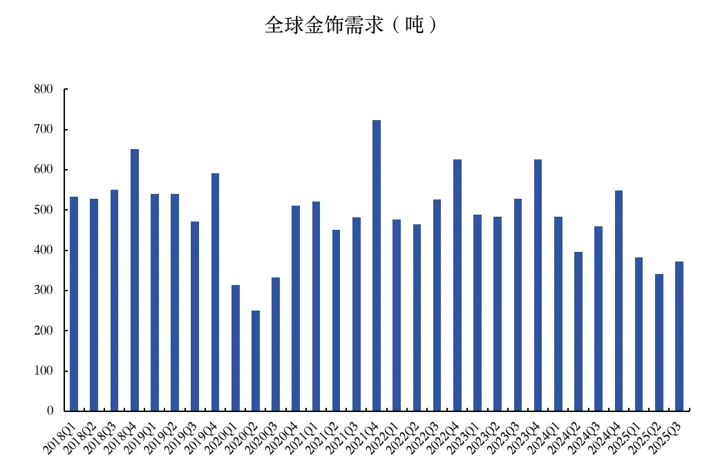 高金价对传统消费端的压制正在加剧。从需求趋势来看,2024-2025年全球金饰需求大幅下滑,2025年前三季度为1095吨,较2024年同期的1339吨下降18.2%,已回落至接近2020年疫情时期的低位水平。这一趋势未来可能进一步深化:2025年四季度后国际金价持续暴涨,2026年1月更是接近5000美元/盎司,金饰的装饰属性在成本压力下持续弱化,购买力不足和“恐高”的观望情绪成为阻止消费者购金的重要原因。