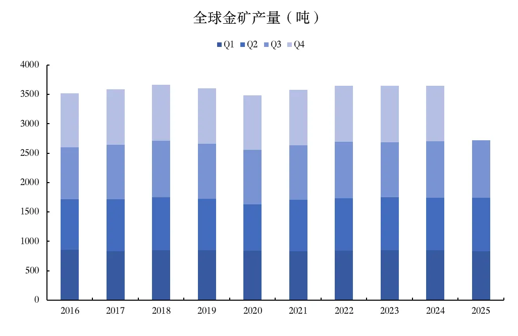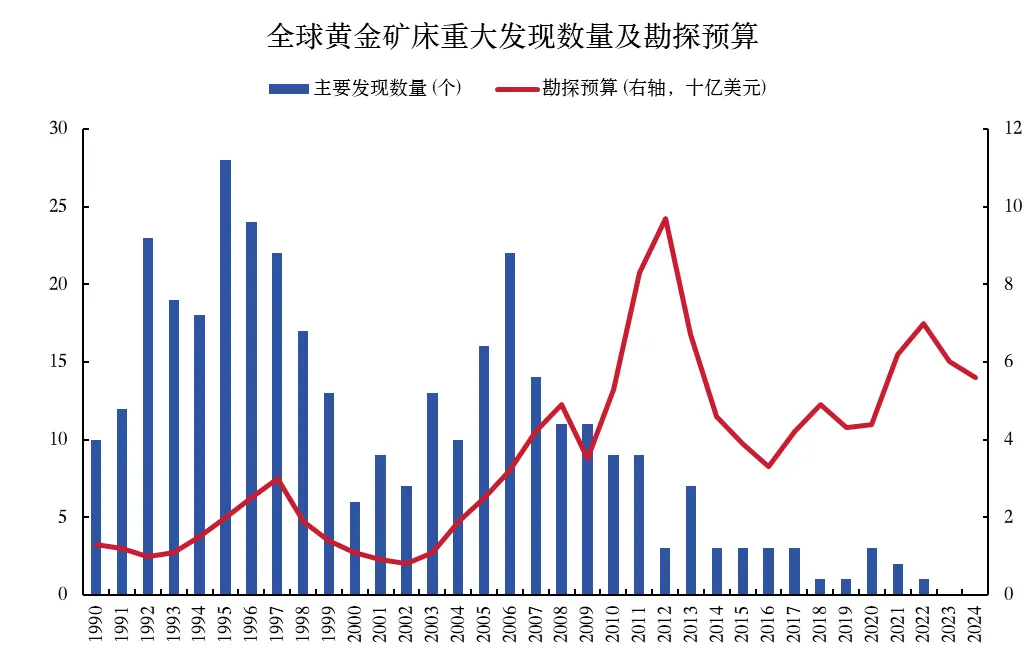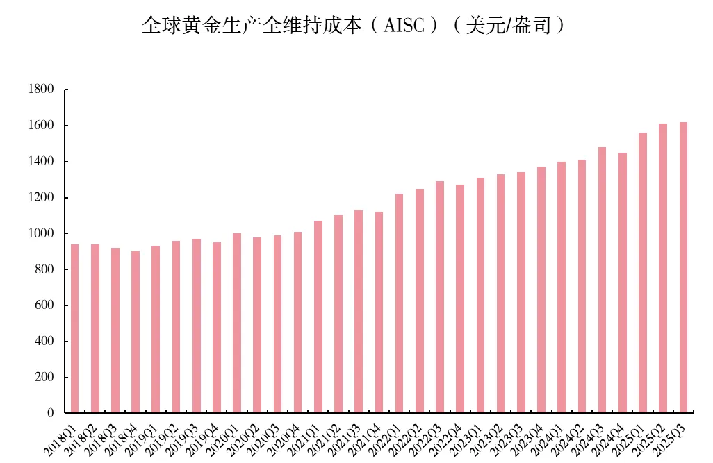 金矿产能的增长面临着较为严重的系统性制约。全球金矿勘探进入低谷期,金矿发现数量日益减少,储量也越来越小,据标普全球研究显示,几乎所有重要矿床(储量大于200万盎司)都是2010年以前发现的,而2023-2024年间重大发现数量为0;生产成本持续上升,受开采难度加大、通胀以及劳动力成本上升的影响,2025年全球黄金平均全维持成本(AISC)已突破1600美元/盎司大关;金矿开采品位逐年下降,标普全球研究显示,2012到2022年间,全球金矿平均开采品位从约1.3克/吨降至约1克/吨,且仍处于下降趋势之中,随着成熟矿山的高品位资源逐渐枯竭,部分新投产的项目(特别是澳大利亚和加拿大的大型露天矿)品位在1克/吨或更低。多重制约因素影响下,未来全球金矿产能大概率继续保持稳定,甚至可能出现下滑。
