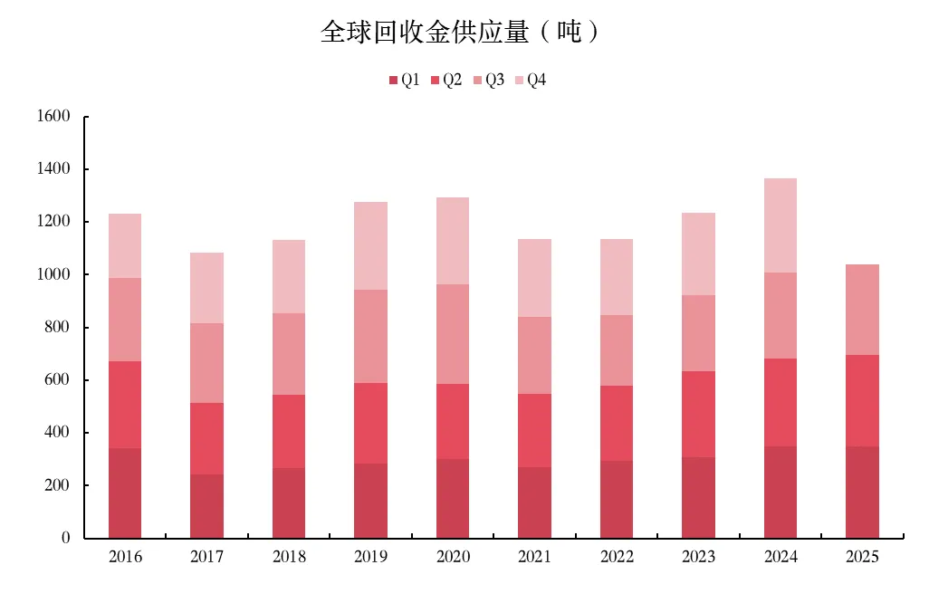 图表12:回收金供应量近年呈逐年小幅增长态势