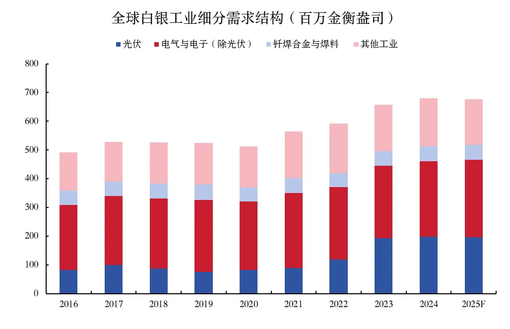 以消费电子、数据中心、半导体为代表的电子产业白银需求弹性极低,是支撑银价的最稳固力量,在AI革命的大背景下具有巨大扩张潜力。根据MetalsFocus测算,一部高端智能手机的含银量通常仅在40至60毫克之间,以每盎司80美元的价格计算,单部手机的白银材料成本也仅约为0.15美元,成本占比不足0.02%;此外,白银在印刷电路板(PCB)和半导体封装中起着决定性的导电和抗氧化作用,且替代材料(如铜、石墨烯)在小型化和可靠性上仍难以企及白银的物理性能,低成本占比和高重要性导致电子行业对白银的需求表现出近乎绝对的价格不敏感。随着2024年以来AI算力需求的爆发,高性能服务器、AI芯片封装对白银的需求量持续上升,未来仍具有巨大扩张潜力。