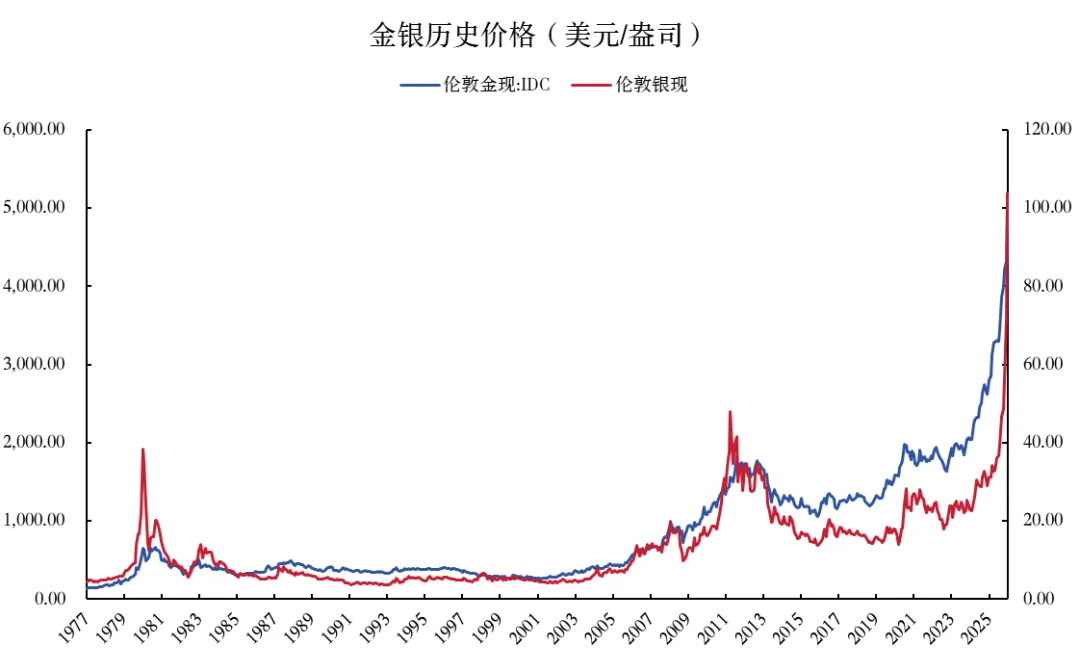 本轮白银历史性行情或已进入高峰期。自1975年以来的50年中,白银共经历了3轮历史性暴涨行情:第一次是1978-1980年的亨特兄弟操纵市场事件,伦银最高累计上涨804%;第二次是2009-2011年的量化宽松+债务危机,伦银最高累计上涨420.6%;第三次就是本轮工业需求+库存下降+货币宽松主导的行情,截至2026年1月23日,2024年以来伦银累计涨幅达到334.6%,需要警惕极端波动风险。
