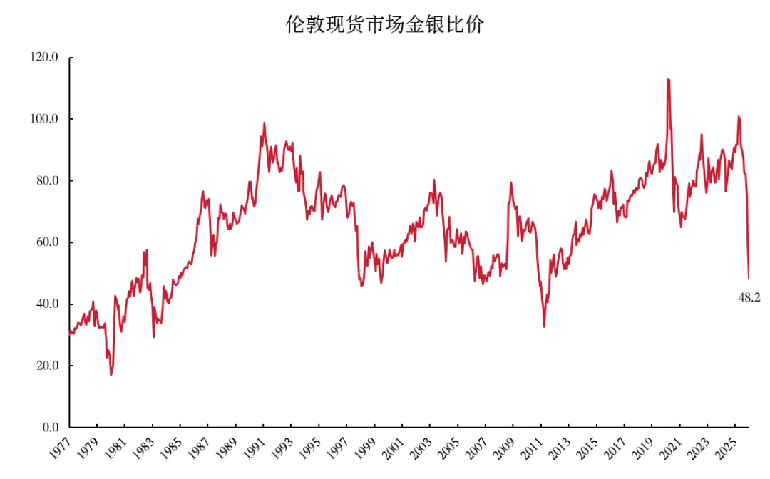 金银比回归是本轮白银行情加速的重要驱动因素,当前金银比已回到较低水平。在相对价值预期、资金避险等多方面因素的影响下,过去50年的大多数时间中金银比在40-80之间波动。随着本轮贵金属行情中金价的持续上涨,伦敦现货市场金银比在2025年4月一度达到100.8的峰值,是近50年来仅低于2020年4月的第二高位。2025年5月白银开始高速上涨后,金银比快速回归,截至2026年1月23日,伦敦现货市场金银比下降至48.2,位于近50年17.7%分位数,银价相对金价的性价比已回落至较低水平。