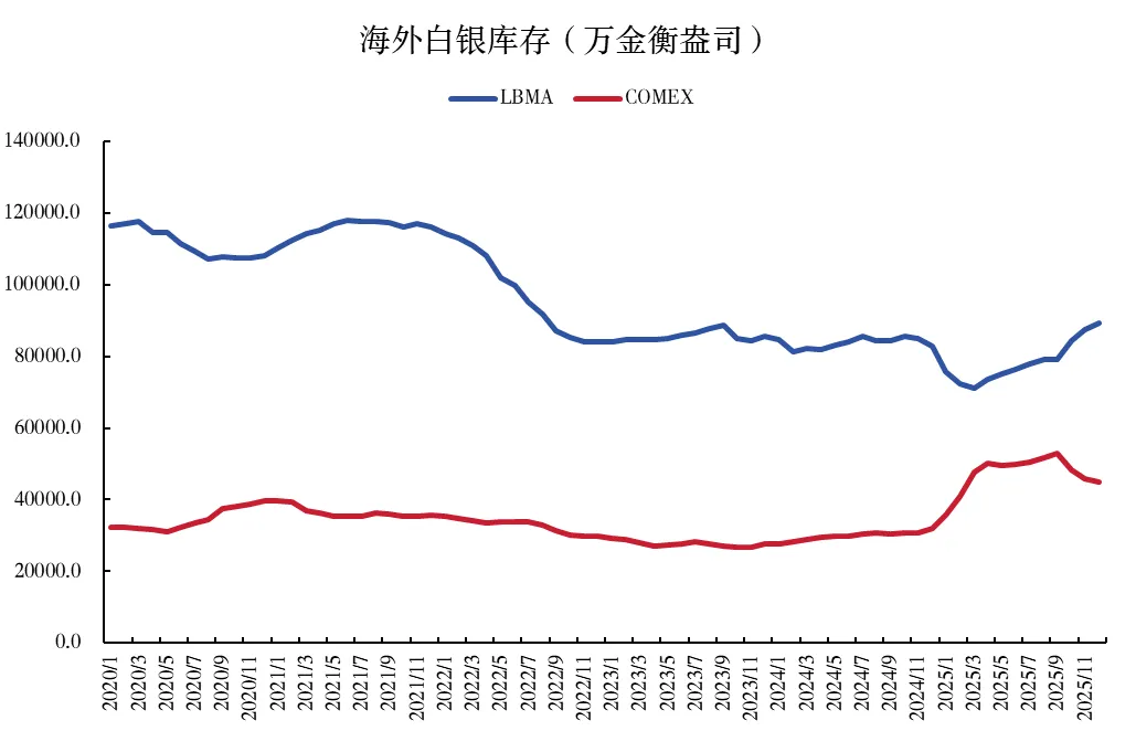 供需缺口使全球白银库存持续快速下滑。海外方面,在持续的供需缺口影响下,伦敦金银市场协会(LBMA)白银库存从2020年初的近12亿金衡盎司下降至2025年底的9亿金衡盎司,纽约商品交易所(COMEX)则在2025年受关税导致的移仓影响有所回升,但全球库存的整体下滑趋势难以扭转。国内方面,上期所、上金所的白银库存自2020年以来持续走低,2025年再度出现断崖式下降,上期所从4530万盎司下降至2223万盎司,降幅50.9%;上金所从4047万盎司下降至2487万盎司,降幅38.5%,供应安全边际几乎消失。在供需缺口(1.5-2亿金衡盎司/年)难以补足的大背景下,目前库存的持续下降趋势很难扭转,短期内或对银价继续形成支撑。