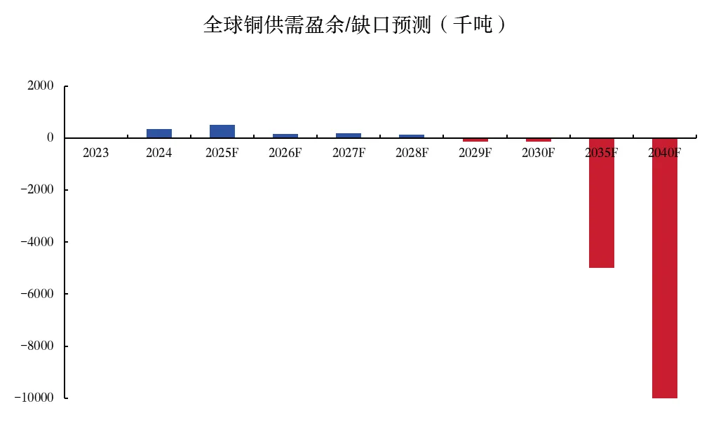 2025年以来铜在除贵金属外的主要大宗商品中表现尤为强劲,其上涨逻辑源于市场对中长期结构性短缺提前定价。从当前基本面看,全球铜市场实际上仍存在约50万吨的小幅供给盈余,整体处于供需相对平衡的状态。然而,自2025年年中以来,铜价已录得超过30%的显著涨幅,这主要反映了市场对未来供需错配的提前定价:随着AI算力基础设施的大规模建设和新能源革命的深化,铜作为关键战略资源的地位日益凸显。由于现有矿山面临品位下降和产量萎缩的挑战,而新矿山的开发周期较长,供给端的扩张潜力明显受限。根据预测,若供给端无法实现实质性突破,到2040年全球铜需求的剧增将导致高达1000万吨的供需缺口。由康波周期和技术革命驱动的长周期需求爆发与供给刚性之间的矛盾,是支撑本轮铜价上涨并有望继续驱动其中长期上行的核心驱动力。