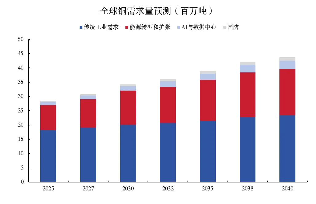 随着电力及相关设备需求的高速增长,中长期全球铜消耗量将持续走高。铜被称为“工业之母”,在电力、家电、建筑、汽车、机械等各个工业领域都有广泛使用;随着AI、新能源所引领的新一轮康波周期开启,铜凭借其在新能源和AI算力基础设施中的重要地位,也被称为AI时代的“新石油”。美国于2025年11月将铜列为关键矿产,这也体现其重大的战略意义。铜具有卓越的导电性(仅次于银)、机械性能、散热性、安全性和耐腐蚀性,虽然铝、塑料和光纤在部分特定用途上可以与之竞争,但在大多数应用中难以被替代。根据标普全球预测,铜的需求量将从2025年的每年2800万吨增长到2040年的每年4200万吨,比目前水平增长约50%。