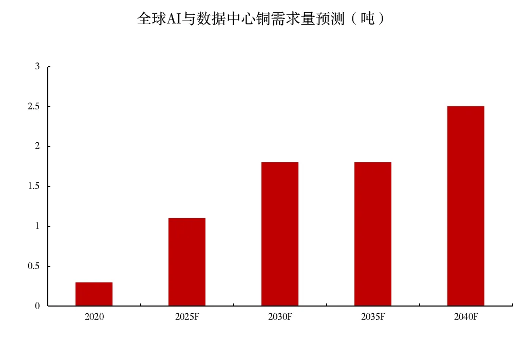 数据中心和AI将在未来10-15年创造新的铜需求增长点。电力供应对数据中心至关重要,而铜又是电力供应的必要组成部分。标普全球预测,数据中心的铜需求将从2025年的110万吨增至2040年的250万吨。到2030年,人工智能训练相关的数据中心铜需求将占数据中心铜总需求的58%。在人工智能训练的年新增容量趋于稳定后,人形机器人和自动驾驶的数据中心可能会在2035年以后继续推动铜需求增长。
