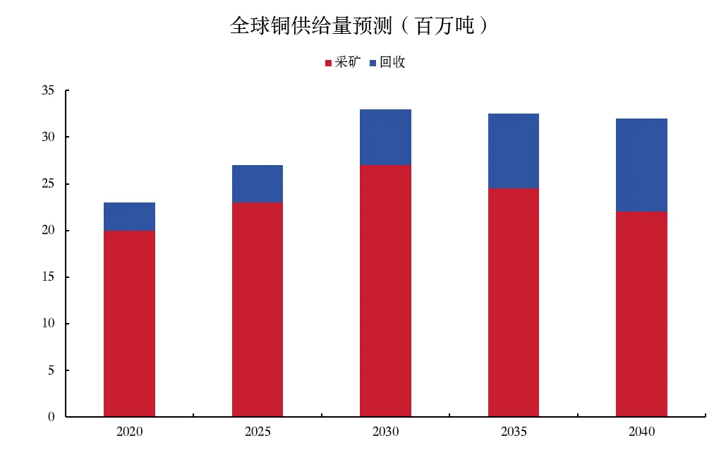根据目前趋势,铜的供给量中长期扩张潜力较为有限,难以弥补缺口。尽管受铜价上行影响部分铜矿开采加速,导致短期内铜矿供应量会增加,但现有矿山的产量会随着矿龄的增长而下降。根据标普全球预测,按照目前的勘探和开采节奏,到2040年,矿产铜供应量可能会从目前的2300万吨下降到2200万吨。虽然到2040年,回收铜供应量可能从400万吨增加到1000万吨,但这仍不以弥补供需缺口。目前,铜的供需基本平衡(有约50万吨的盈余),总量约为2800万吨。但根据前文所述,到2040年,按预计全球铜需求将上升至约4200万吨,届时供需缺口或达1000万吨。