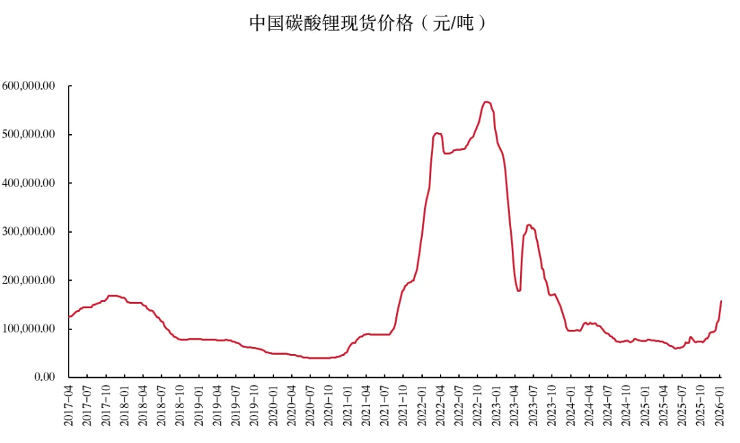 在供给过剩所致的连续接近4年的连续下跌后,2025年下半年碳酸锂价格开始缓慢回升,12月后加速上涨。受电动车销量的爆发驱动,2021-2022年间碳酸锂从约50000元/吨暴涨至接近600000元/吨,制造了巨大的泡沫,高企的价格导致全球范围内锂矿产能盲目扩张及中下游环节的大规模囤货,随后引发了长达三年的深度去库存周期与产能出清。截至今年1月23日,GFEX碳酸锂价格已从2025年中59802元/吨的低位上涨204%,达到每吨181520元/吨,涨幅高达204%。随着全球锂供给过剩量正在逐渐收窄,供需缺口有望在2026年进一步弥合。由于供给端新增项目投产节奏放缓,而需求端储能与动力电池保持稳步增长,预计碳酸锂价格中枢将告别底部区间并持续上移,市场进入震荡修复周期。