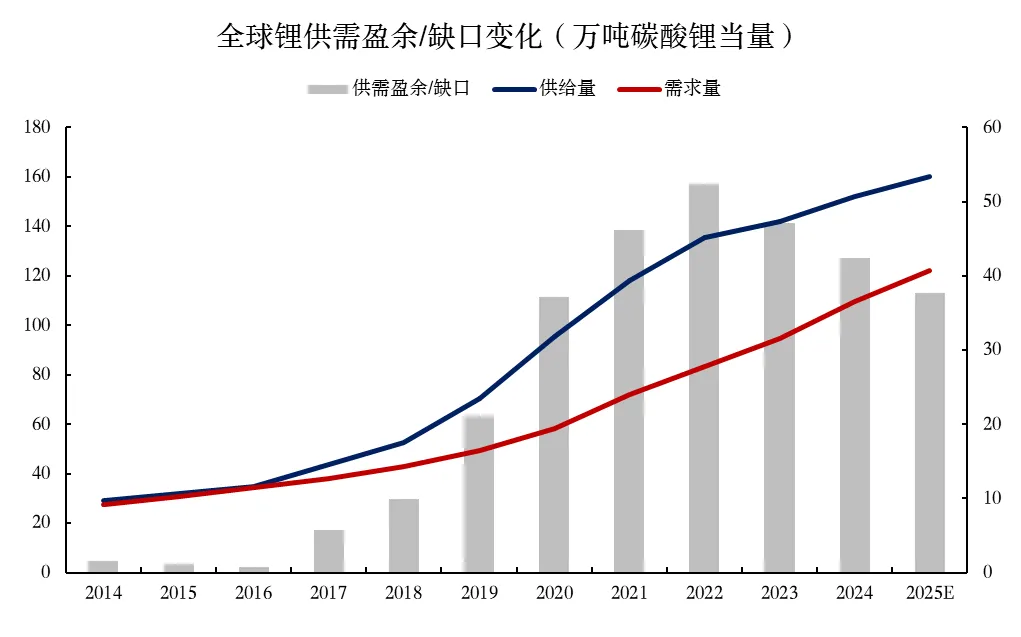 图表38:全球锂供给过剩量正在逐渐收窄