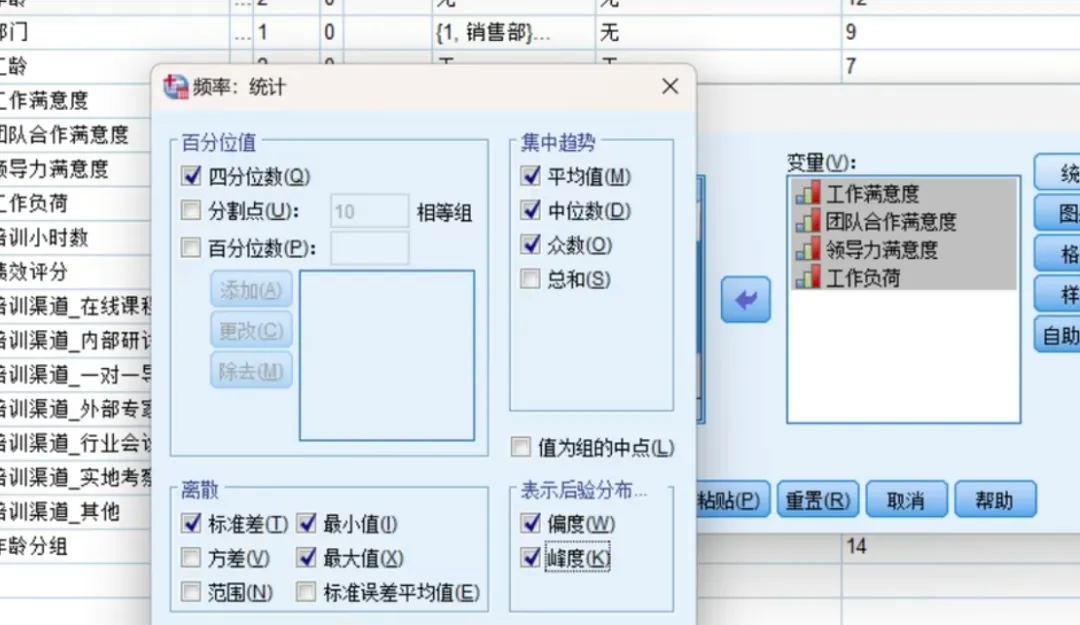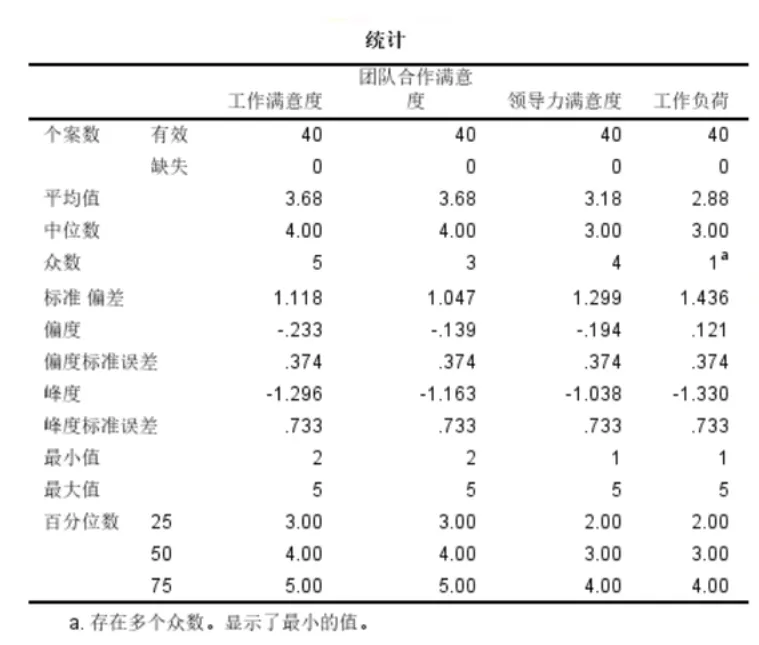 离散程度:工作负荷的标准偏差最大,为1.436,说明员工对工作量的感受差异较大;领导力满意度的标准偏差也较高,为1.299,意味着员工对领导的评价分歧较明显,而团队合作满意度的数据最集中,标准偏差1.047。 分布形态:所有指标的偏度绝对值均小于1,说明数据分布相对对称,但工作满意度和团队合作满意度呈轻微负偏态,可能与评分“天花板效应”有关,25%的员工给出满分5分。