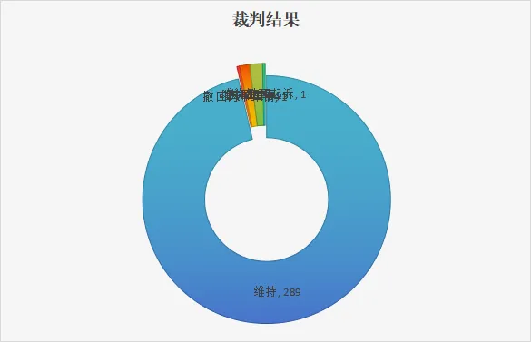 从裁判结果来看,维持一审判决的裁判文书有289份,占比96.33%,发回重审的5份,占比1.67%,撤回再审申请的1份,占比0.33%,准许撤回起诉的1个,占比0.33%,撤销一审裁判,指令再审的4份,占比1.33%。
